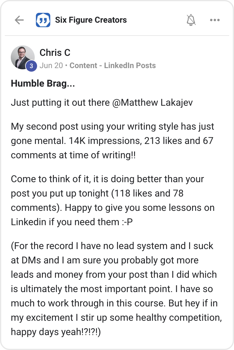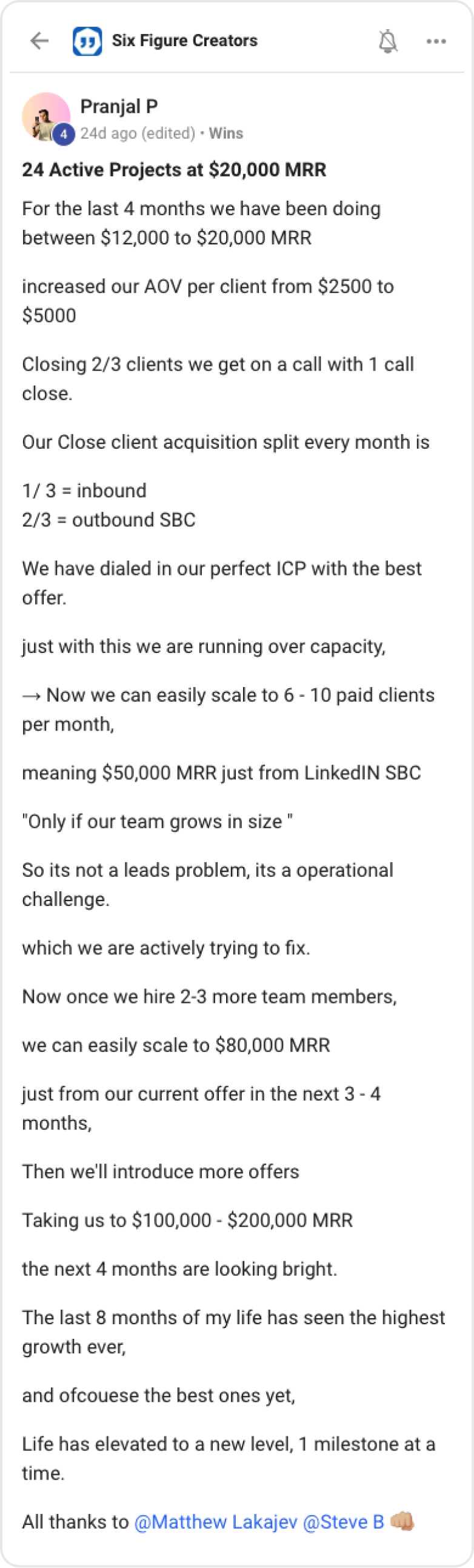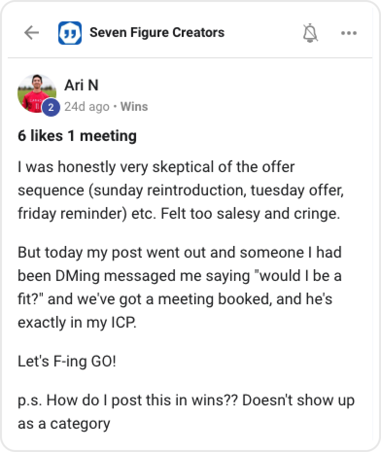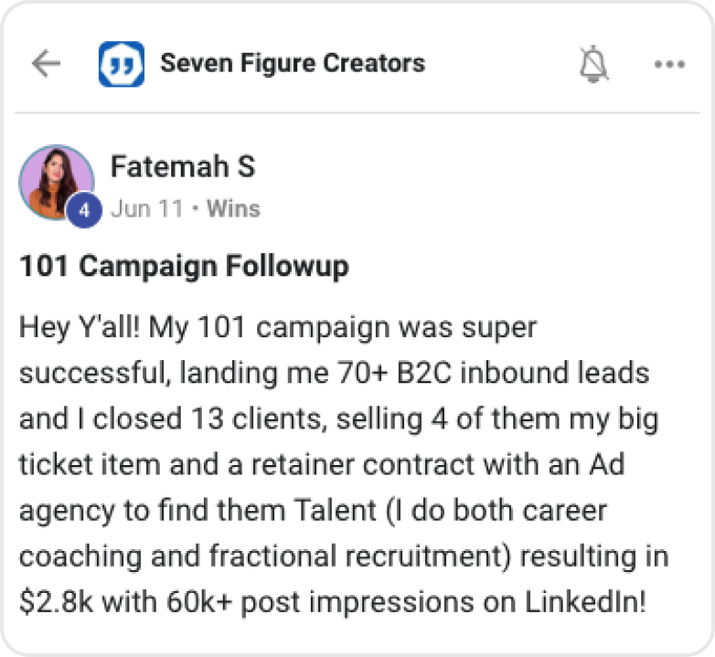 After the Free Course, you’ll have a solid offer to start making sales on LinkedIn. You can then join our Six-Figure Creators program to grow consistent leads and sales.