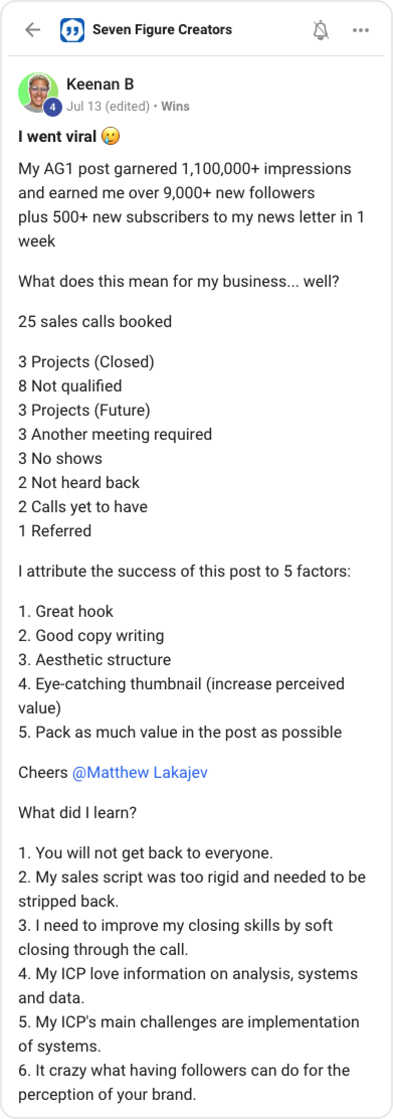 "Post garnered 1,100,000+ impressions and earned me over 9,000+ new followers..."